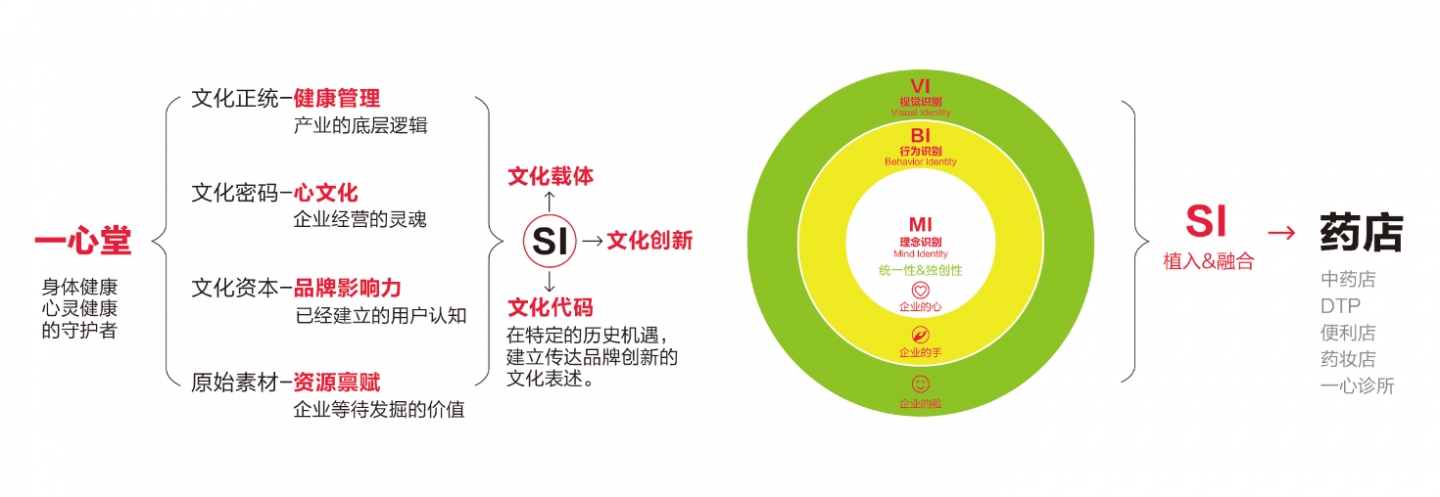 為此,我們依據(jù)品牌感知層和體驗(yàn)層為原則,在一心堂集團(tuán)CI基礎(chǔ)上分化出獨(dú)立的藥店4S戰(zhàn)略體系,4S戰(zhàn)略完全區(qū)隔于藥店傳統(tǒng)的SI空間設(shè)計(jì)體系,而是涵蓋了藥店的文化、品牌、體驗(yàn)、營(yíng)銷四大維度的整合戰(zhàn)略策劃。