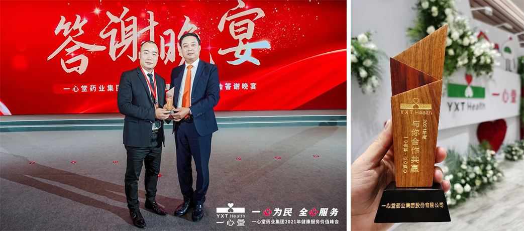 一心堂全新品牌形象與2021年11月于海口隆重亮相會(huì)場(chǎng)晚宴的頒獎(jiǎng)環(huán)節(jié),董事長(zhǎng)阮鴻獻(xiàn)先生親自為李華清團(tuán)隊(duì)頒發(fā)了“與你合作共贏”獎(jiǎng)杯,這是近一年來一心堂集團(tuán)對(duì)李華清團(tuán)隊(duì)的最大肯定和鼓勵(lì)。同時(shí),也為我們雙方開啟第二階段工作提供了堅(jiān)定的信心。