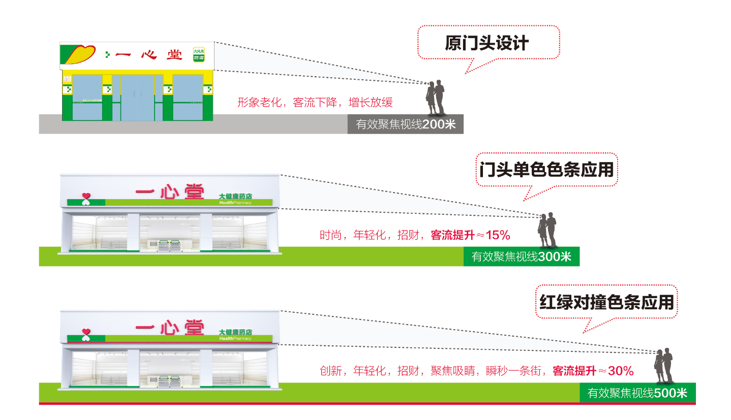 法國(guó)色彩大師郎克羅說:“完善的色彩計(jì)劃可以讓產(chǎn)品(服務(wù))在不增加成本的情況下,提高其15-30%產(chǎn)品(服務(wù))價(jià)值或利潤(rùn),這就是色彩的力量。” 在門頭設(shè)計(jì)開發(fā)的時(shí)候,我們利用色彩的視覺牽引特性和二級(jí)門頭立體發(fā)光效果,并打破了標(biāo)志與名字齊平的傳統(tǒng)組合方式,將LOGO應(yīng)用在下方,與淺綠色條共同起到承載和視覺牽引效果,形成一心堂門店全新的品牌資產(chǎn)。二級(jí)門頭的“紅,綠色條對(duì)撞”是一心堂門頭殺手級(jí)的色彩應(yīng)用策略,因?yàn)樵谒泄獠ㄖ屑t色光的波長(zhǎng)最長(zhǎng),而綠色的可視函數(shù)最高,也更容易聚光,這就是激光筆為多用綠光的原因,當(dāng)這兩個(gè)補(bǔ)色并列時(shí),會(huì)引起強(qiáng)烈對(duì)比的色覺,會(huì)感到紅的更紅、綠的更綠。從而就能快速實(shí)現(xiàn)百米聚焦,瞬秒一條街,為藥店引流、招財(cái)、增量。